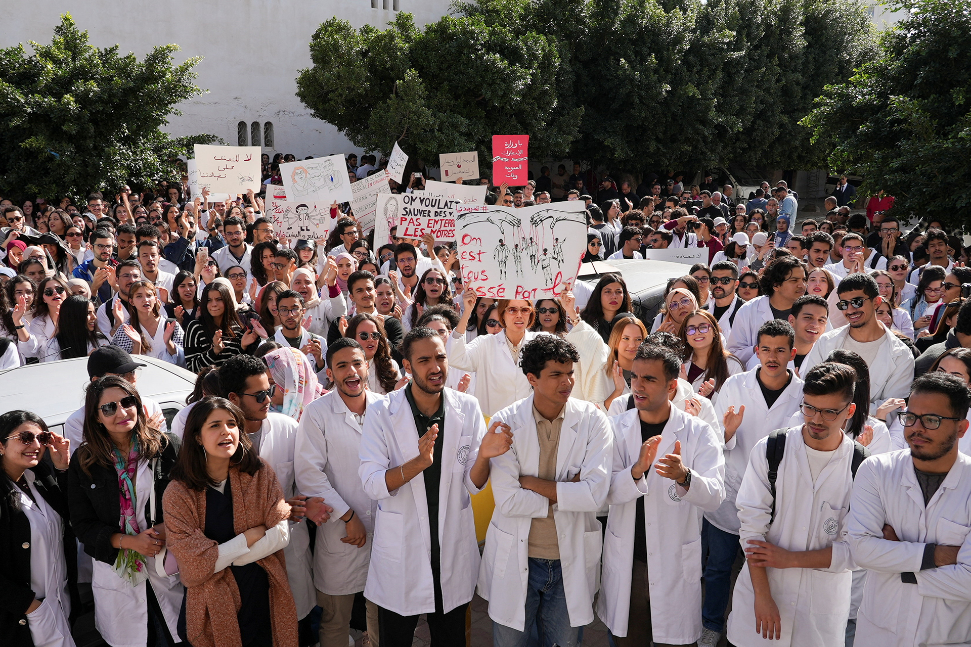 أضرب آلاف الأطباء الشبان في تونس اليوم الأربعاء عن العمل بجميع المستشفيات وكليات الطب واحتج المئات منهم مطالبين بزيادة الأجور ومحذرين من أن تدهور الأوضاع في