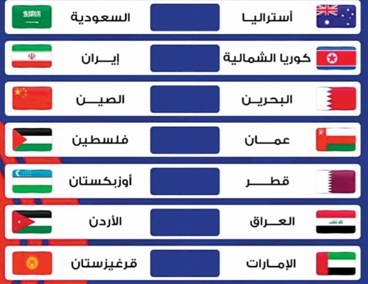 وفي المجموعة ذاتها، يستضيف المنتخب العماني شقيقه الفلسطيني الساعة 7:00 مساءً على مجمع السلطان قابوس الرياضي ببوشر، في حين يحل المنتخب الأردني ضيفا على نظيره العراقي الساعة 7:15 على استاد البصرة الدولي.