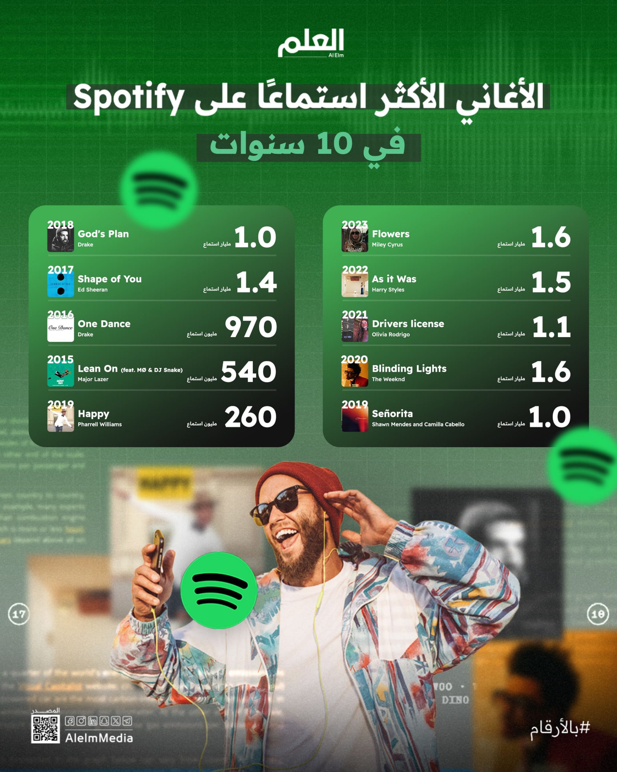 وسلط موقع Visual Capitalist الضوء على الأغنية الأكثر استماعًا في كل سنة من 2014 وحتى 2023، معتمدًا على بيانات من Spotify وComplex وWikipedia.