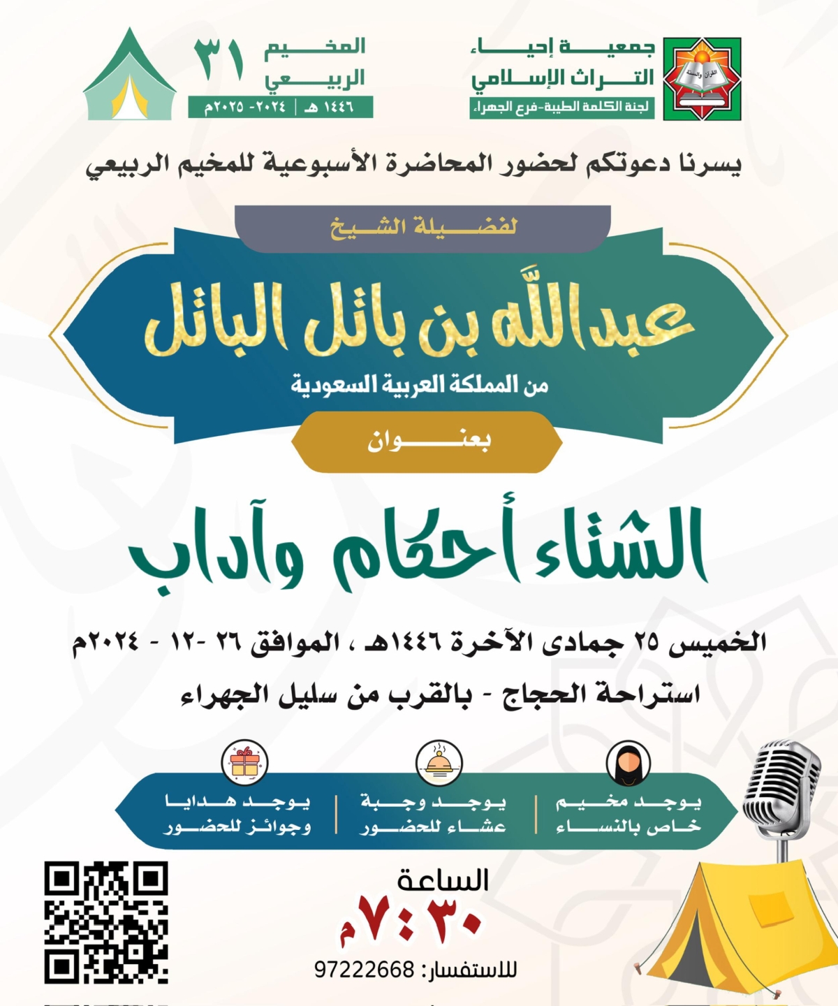 تستضيف جمعية إحياء التراث الإسلامي الشيخ عبدالله الباتل من السعودية، لإلقاء محاضرة بعنوان «الشتاء أحكام وآداب»، مساء الغد، في استراحة الحجاج بالقرب من سليل الجهراء، ضمن فعاليات مخيمها الربيعي 31 بالجهراء.