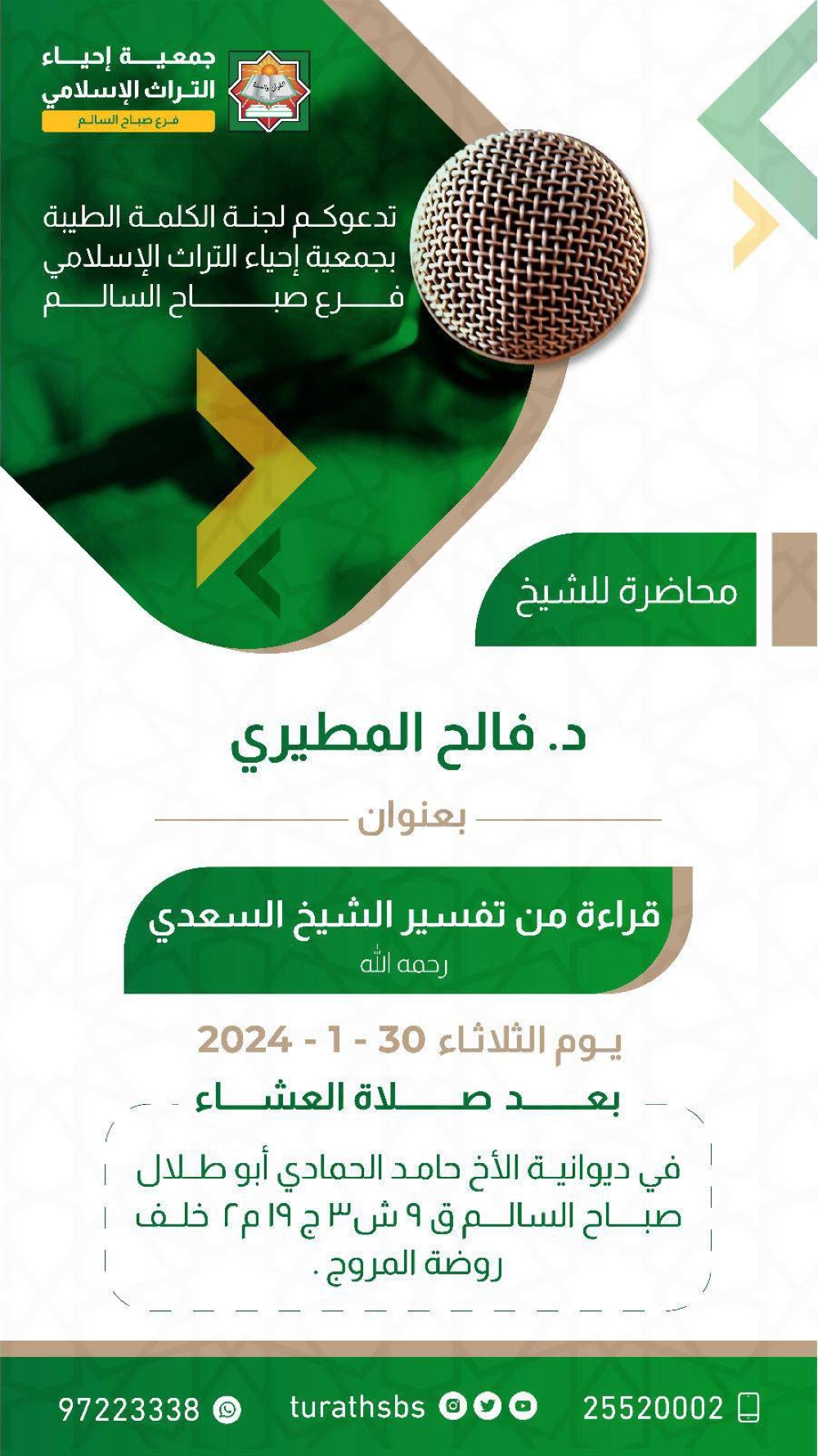 وأشارت الجمعية، في بيان، إلى تنظيم محاضرة بعنوان «قراءة من تفسير الشيخ السعدي رحمه الله»، يحاضر فيها الشيخ د. فالح المطيري مساء غد في ديوانية حامد الحمادي بمنطقة صباح السالم. وأضاف البيان: كما نظمت الجمعية درساً أسبوعياً في شرح «سلسلة أسماء الله الحسنى» للشيخ د. عيسى الجاموس مساء اليوم في مسجد «نوير الوطري» الكائن في الرحاب. ودعت الجمعية الجمهور إلى المشاركة في مثل هذه الدروس، وغيرها من الأنشطة التي تقيمها، الأمر الذي يعود عليهم بالنفع والفائدة في دينهم ودنياهم.