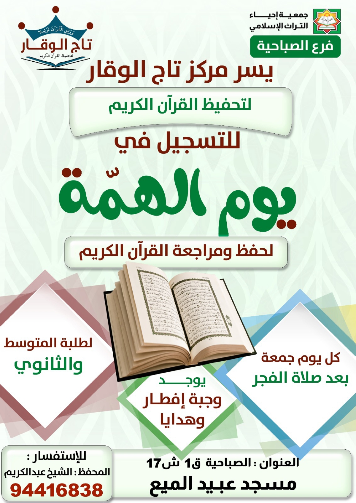 وستكون الدراسة فيها كل يوم جمعة بعد صلاة الفجر في مسجد عبيد الميع بالصباحية. وقد أهابت الجمعية بأولياء الأمور لتسجيل أبنائهم في حلقات تحفيظ القرآن الكريم التي تقوم بها، انطلاقاً من دعمها لكل ما يخدم أفراد المجتمع.
