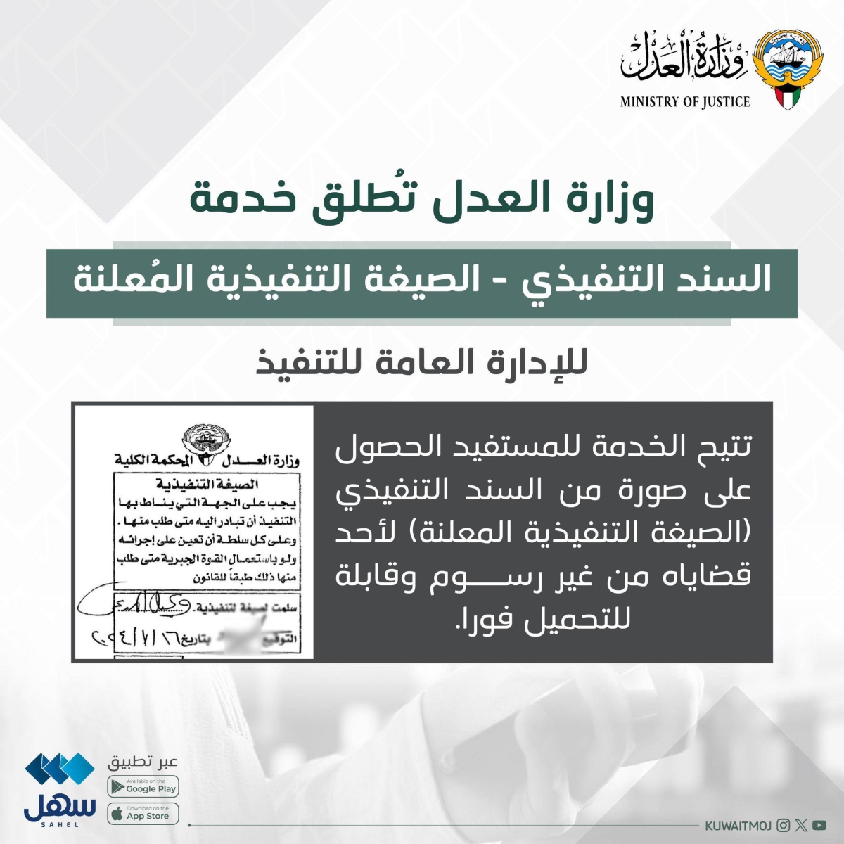 استكمالاً للجهود والخطوات الرامية إلى تحقيق التحول الرقمي في وزارة العدل، وتسهيلاً على جمهور المتعاملين، أعلن وزير العدل والأوقاف والشؤون الإسلامية د. محمد الوسمي إطلاق خدمة «السند التنفيذي- الصيغة التنفيذية المعلنة» عبر تطبيق «سهل» الموحد للخدمات الإلكترونية الحكومية.