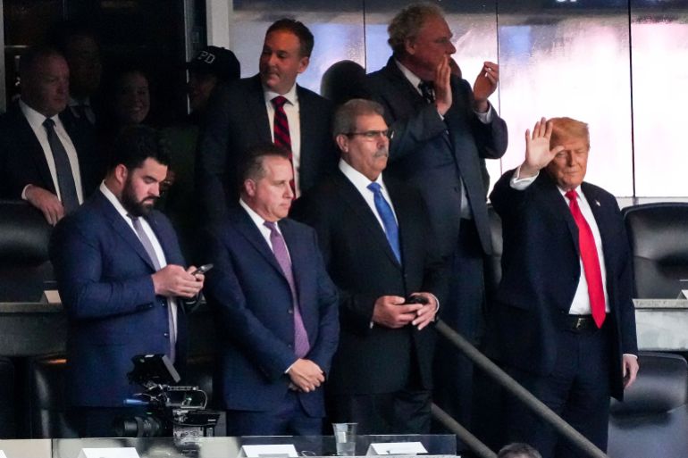 وغادر ترامب بعد وقت قصير من نهاية الشوط السابع، الذي تضمن غناء أغنية “ليبارك الله أميركا” كما هو معتاد في مباريات يانكيز في 11 سبتمبر، وظهر ترامب على الشاشة الكبيرة 3 مرات متتالية، وقال المذيع شاكرا ترامب: “أهلًا بعودتك، يا ابن نيويورك، الرئيس الـ45 والـ47”.