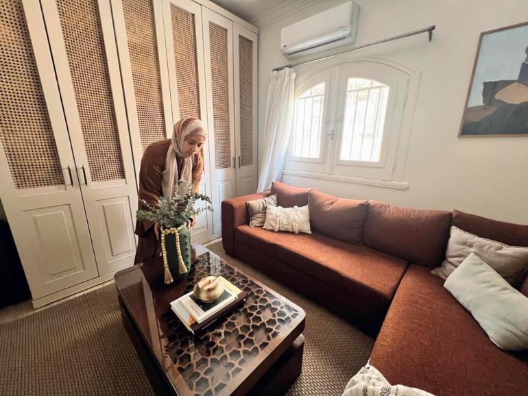 الدكتورة مي فتحي أثناء تنسيق الديكور في منزلها (الجزيرة)