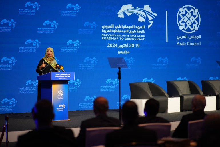 من جانبها، قالت نائبة رئيس المجلس العربي والناشطة اليمنية الحائزة جائزة نوبل للسلام، توكل كرمان إن الأنظمة الغربية التي تدعي الديمقراطية خانت مبادئها وتحالفت مع الثورات المضادة والمستبدين ودعمت المليشيات في العالم العربي.