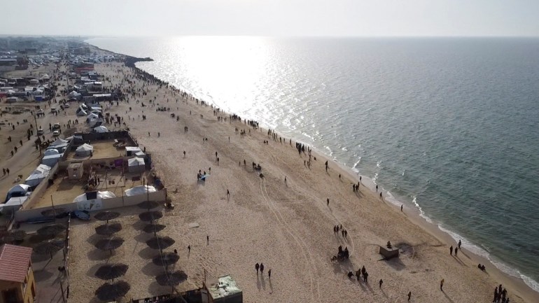 فلسطينيون على شاطئ دير البلح وسط قطاع غزة أملا في الحصول على بعض المساعدات الأردنية (رويترز)