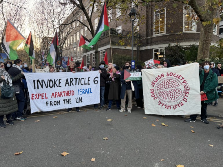 نظم طلاب يهود، متضامنون مع فلسطين، مظاهرة أمس الاثنين لدعم المقررة الأممية المعنية بحقوق الإنسان بالأراضي الفلسطينية فرانشيسكا ألبانيز، أمام كلية الدراسات الشرقية والأفريقية في جامعة لندن.