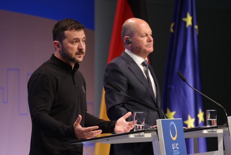 المستشار الألماني أولاف شولتس (يمين) رفقة الرئيس الأوكراني فولوديمير زيلينسكي في ندوة صحفية ببرلين (غيتي)