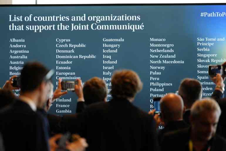 ولم يحظ البيان الختامي بتأييد جميع الدول المشاركة. ووفقا لقائمة نشرتها سويسرا، وافقت على البيان 80 دولة من أصل 93 دولة مشاركة.