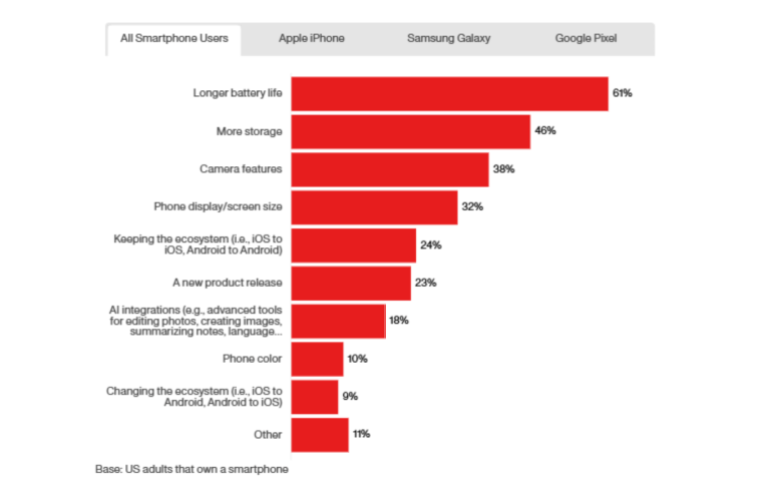 إذ أثبتت الدراسة أن 38% من المستخدمين مستعدون لترقية هواتفهم بناءً على مزايا الكاميرا المستخدمة بالهاتف إلى جانب مزايا البطارية الأكبر ومساحة التخزين الأكبر أيضًا.