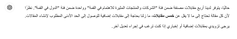 بعد تصنيف المقابلات طلبت منه أن يذكر حالة كل مقال من حيث عدد المقابلات وقد كنت قد أضفت للأوامر أمرا بأن لا يقوم بتلخيص المقالات قبل أن يكون هناك على الأقل 5 مقابلات (قمت بتقليص العدد بعد ذلك لأسباب بشرية).بعد التصنيف طلبت من الذكاء الاصطناعي تلخيص المقابلات لكل مادة، وهذا كان الناتج لمادة “شركات ومنتجات في قمة الويب”: