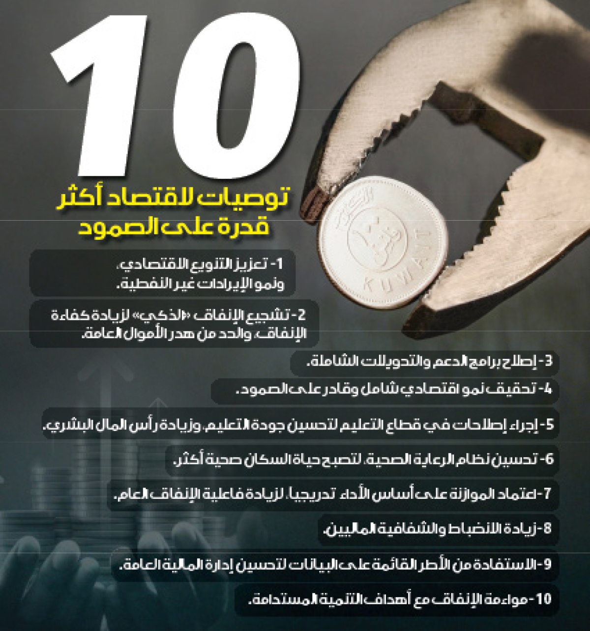 قال مُعدّ التقرير، نيرنجان سارانجي إن «الكويت بحاجة إلى التحرك الفوري لتنفيذ إصلاحات مالية مستهدفة، وذلك ليس خياراً، بل ضرورة لحماية الاقتصاد وضمان رفاهية المواطنين».