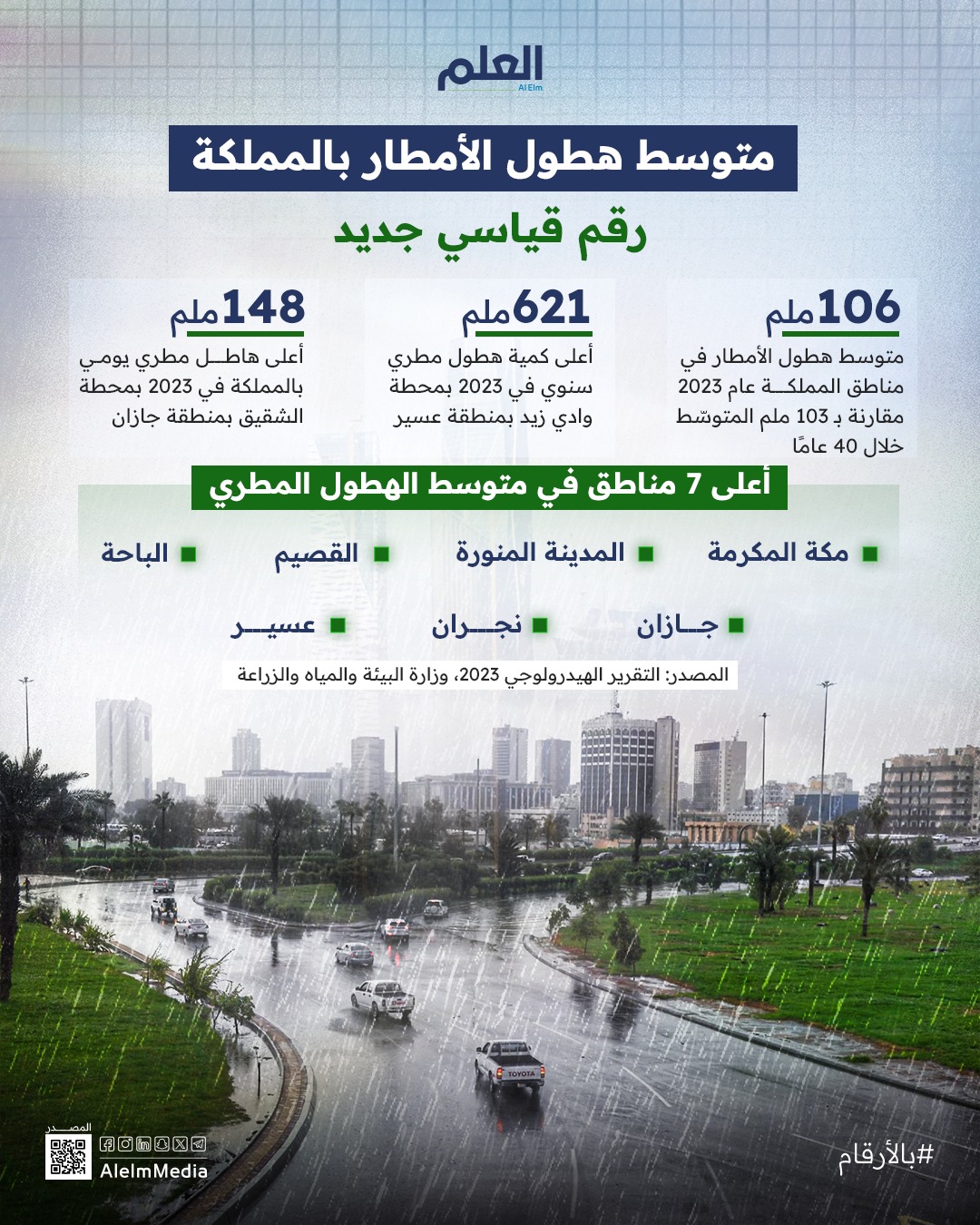 أعلنت وزارة البيئة والمياه والزراعة تسجيل رقم قياسي جديد في متوسط هطول الأمطار في مناطق المملكة المختلفة، في عام 2023.