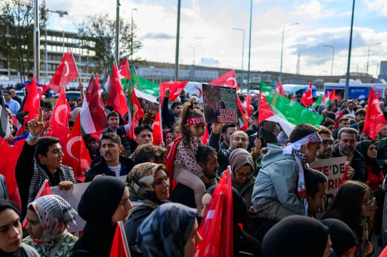 مؤيدون لفلسطين في انتظار وصول ناشطين كانوا مع أسطول الصمود ورحلتهم إسرائيل إلى تركيا (الفرنسية)