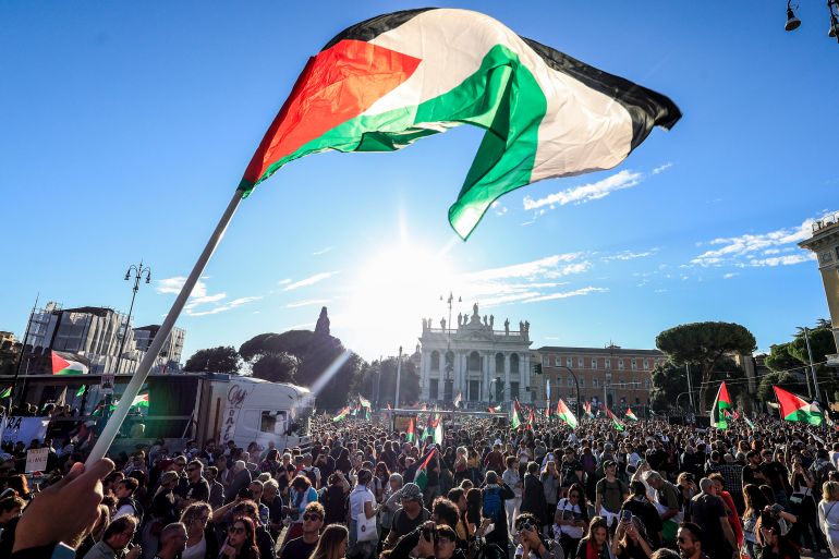 ففي العاصمة الإيطالية روما، خرج مئات الآلاف في مسيرة ضخمة جابت شوارع المدينة مروراً بالكولوسيوم، رافعين الأعلام الفلسطينية ومرددين شعارات منها “فلسطين حرة”.