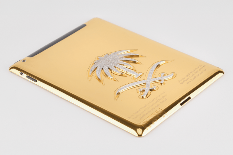 كما تم عرض نسخة ذهبية نادرة من حاسوب “آيباد” اللوحي مرصعة بالألماس على شكل شعار السعودية تعود ملكيتها إلى الرئيس الأميركي الأسبق جورج دبليو بوش التي حصل عليها كهدية مقدمة من الملك عبد الله بن عبد العزيز آل سعود في 2012، وفق موقع دار المزادات “آر آر”.