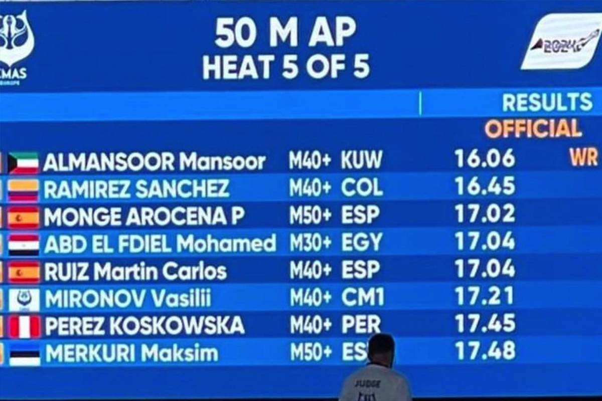 تمكّن بطل الكويت في سباحة الزعانف منصور المنصور من تحطيم الرقم العالمي بفئة «ماسترز» وتحقيق الميدالية الذهبية بفئة «50AP» مسجلاً 16:06 ثانية ضمن منافسات بطولة العالم في العاصمة الصربية بلغراد.