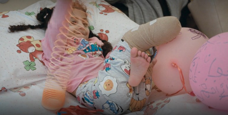 فيمضي وقتا مع طفلة أصيبت ساقها بكسور مركبة، ومع أن حالتها قد تحسنت بعد تلقيها علاجا في المشفى الأوروبي، فإن المُحزن في وضعها يتمثل في جهلها بمصير عائلتها.