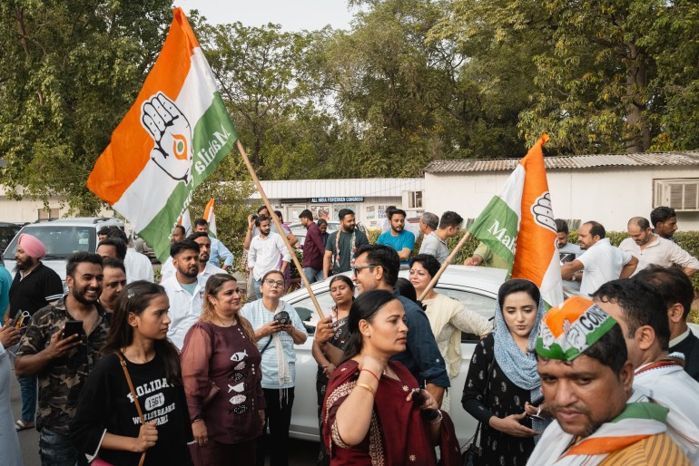 عدد من أنصار حزب المؤتمر الهندي المعارض يتجمعون أمام أحد مقراته (غيتي)
