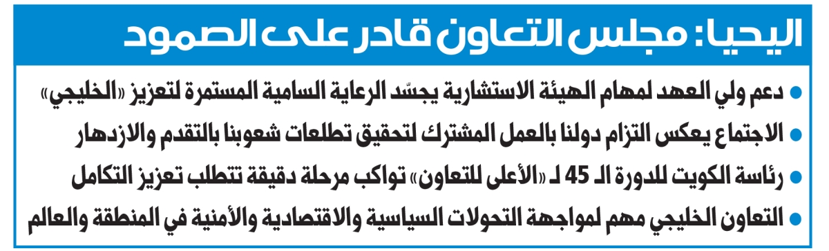 ونقل الوزير اليحيا تحيات سمو أمير البلاد الشيخ مشعل الأحمد وتمنياته لأعمال الاجتماع بالتوفيق والنجاح، مشيداً بدعم سمو ولي العهد الشيخ صباح الخالد لمهام الهيئة الاستشارية الذي يجسد الرعاية السامية المستمرة التي تحظى بها الهيئة لتعزيز مسيرة مجلس التعاون الخليجي.