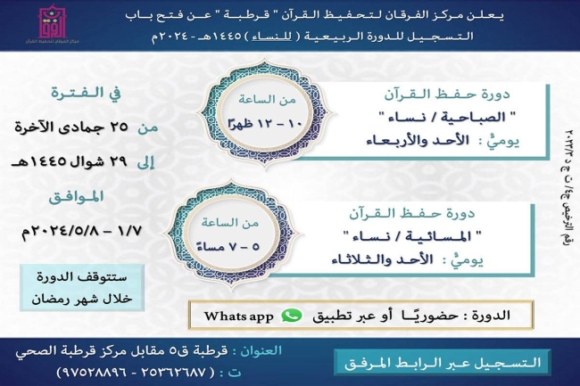 أعلنت جمعية إحياء التراث الإسلامي بدء فعاليات الدورة الربيعية للنساء، والتي يشرف عليها مركز «الفرقان» لتحفيظ القرآن باللجنة النسائية، وتتضمن العديد من الفعاليات والأنشطة مثل