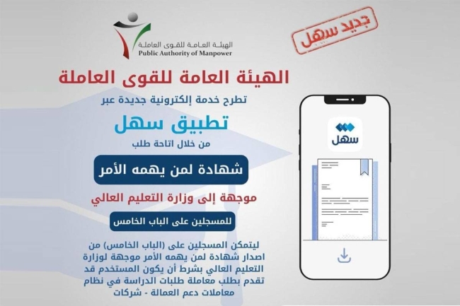 أعلن المتحدث الرسمي باسم التطبيق الحكومي الموحد للخدمات الإلكترونية (سهل)، يوسف كاظم، إطلاق الهيئة العامة للقوى العاملة خدمة إلكترونية جديدة عبر التطبيق تتمثل في «إتاحة