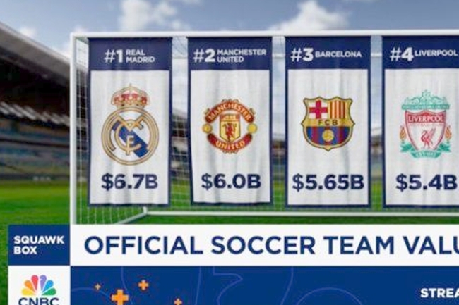 جاء نادي ريال مدريد في صدارة تصنيف شبكة قنوات CNBC للأندية الأعلى قيمة على مستوى العالم، الصادر أمس الاثنين، بقيمة 6.7 مليارات دولار، وحل مانشستر