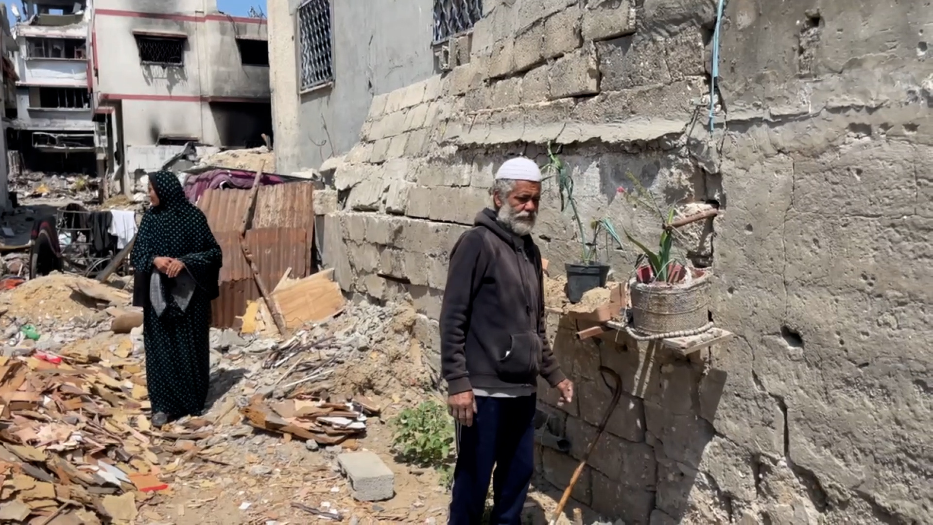 يكافح الفلسطيني المسن جميل الفيومي وعائلته للبقاء والصمود داخل خيمة مؤقتة نصبوها بجوار أنقاض منزلهم المدمر بعد فقد أبنائهم الثلاثة في هجمات إسرائيلية على حي
