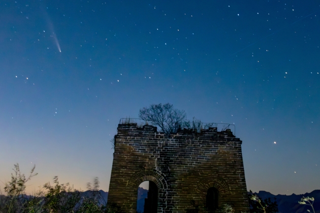 نشرت وكالة شينخوا، أمس، مشهداً للمذنب C/2023 A3 (تسوتشينشان – أطلس) في السماء فوق قسم بانلونغشان من سور الصين العظيم في بكين. وتم رصد المذنب