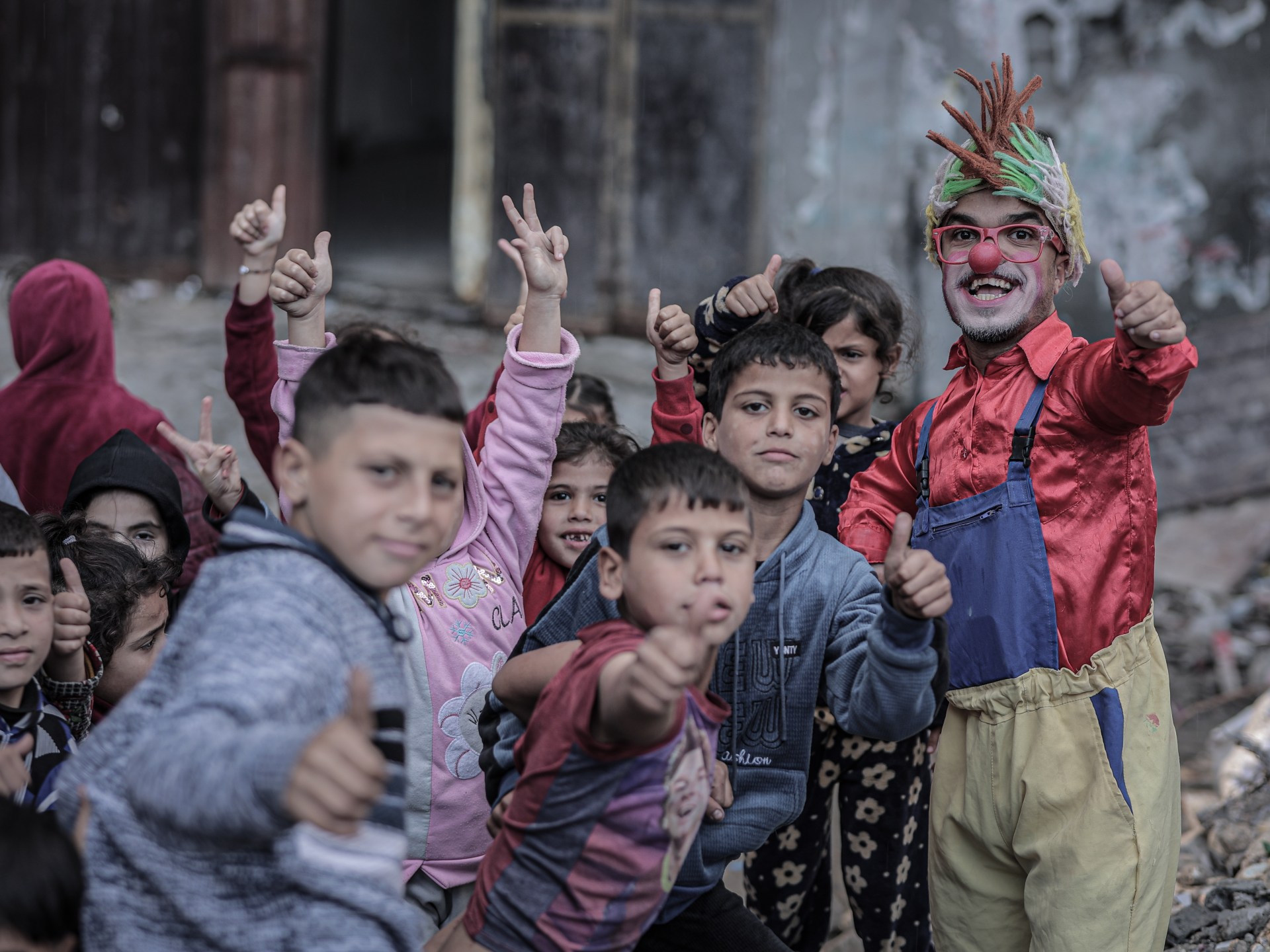 يرتدي الشاب الفلسطيني أحمد أبو سكر زي مهرّج، ويتنقل بين الأحياء المدمرة في قطاع غزة محاولا إدخال الفرح إلى قلوب الأطفال رغم فقدانه أفرادا من