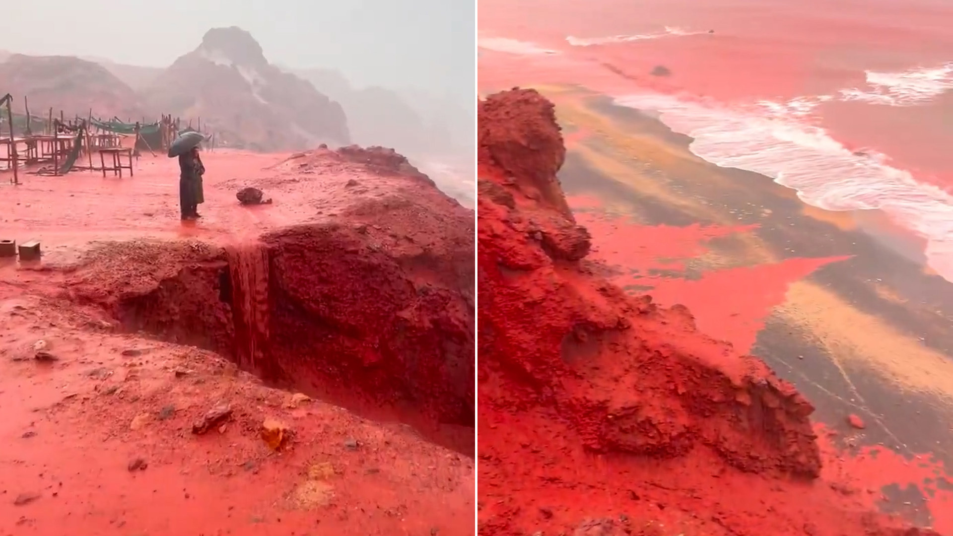تحوّل شاطئ جزيرة هرمز جنوبي إيران إلى مشهد طبيعي مذهل بعد هطول أمطار غزيرة، حيث ظهرت الرمال بلون قرمزي زاه نتيجة تدفق التربة الغنية بأكسيد