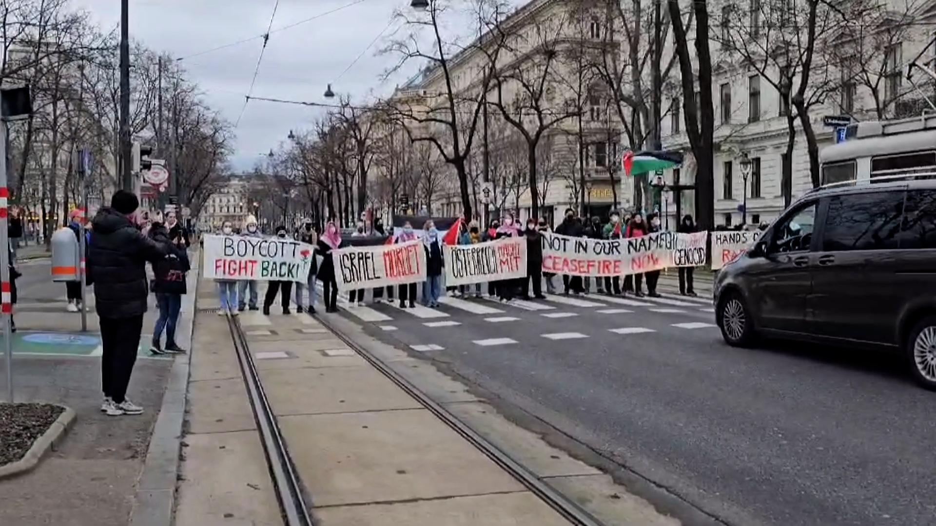 أغلق طلاب جامعيون ونشطاء أحد أهم الشوارع في العاصمة النمساوية فيينا، صباح اليوم الخميس، ضمن وقفة احتجاجية ضد العدوان الإسرائيلي المستمر على قطاع غزة منذ