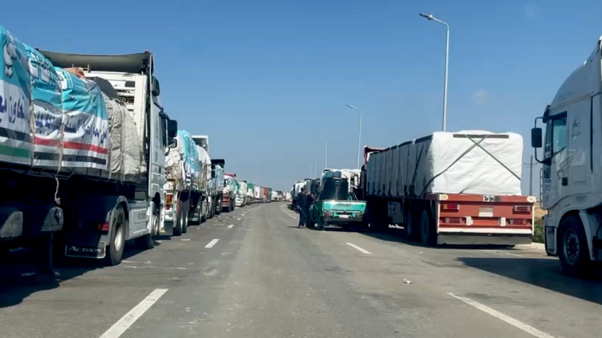 يُظهر مقطع فيديو حصلت عليه الجزيرة تكدس أعداد كبيرة من الشاحنات المحملة بالمساعدات في الجانب المصري بانتظار السماح لها بدخول قطاع غزة. وعلى مساحة كبيرة