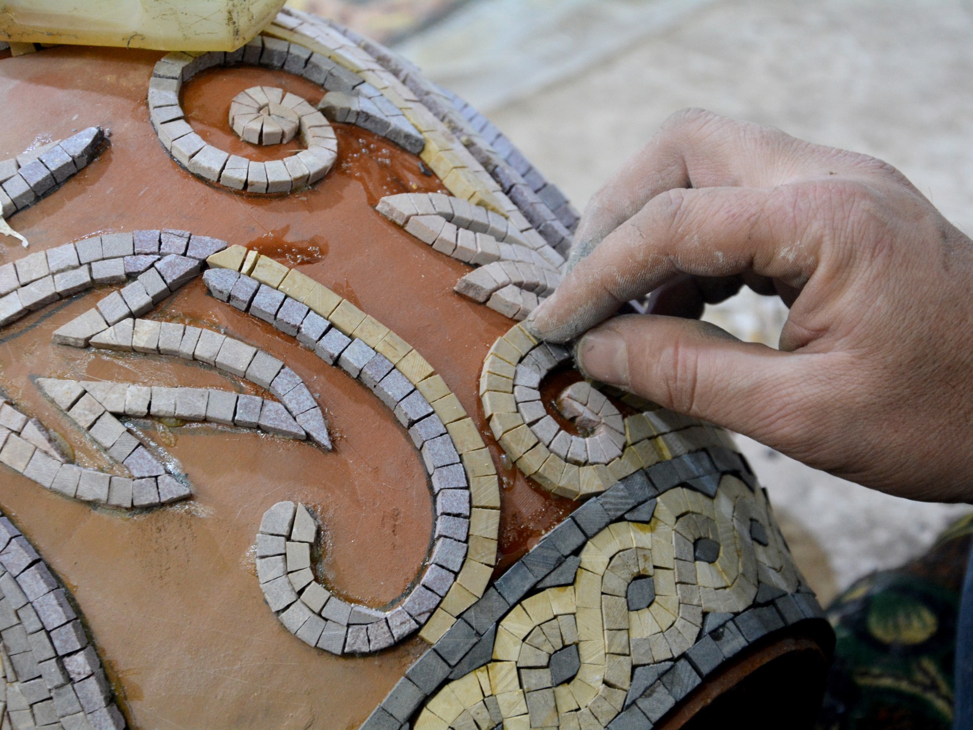 يفرش غسان سعيد الحمود أدواته، المكونة من أحجار وألوان تشكيلية وعدة لوحات، أمامه في مشغل للفسيفساء يقع بالقرب من مدينة سرمدا شمال غرب سوريا. يعمل