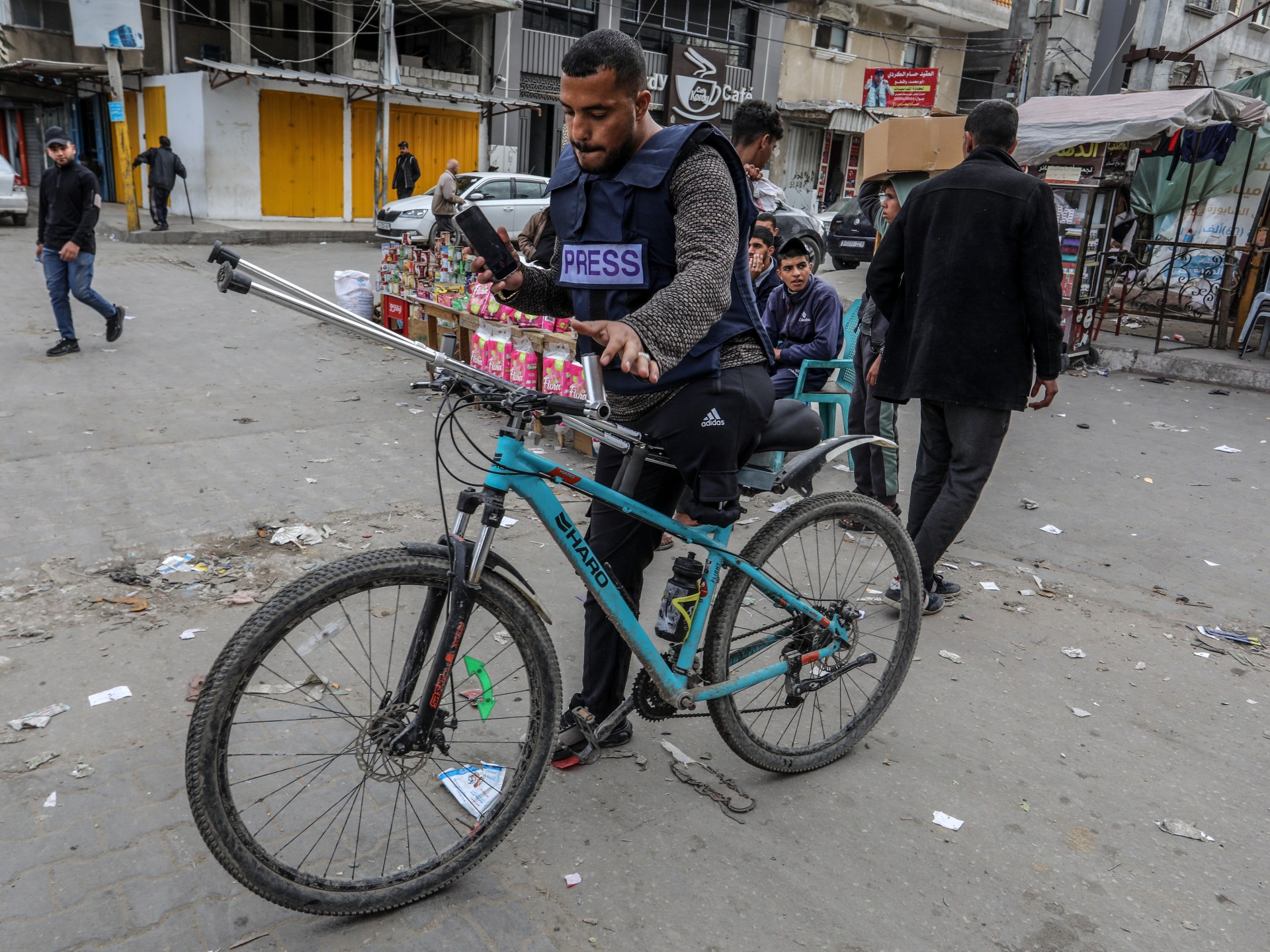 يتحدى الصحفي الفلسطيني حازم سليمان (33 عاما) الصعاب بساق واحدة، حيث يتنقل بدراجته الهوائية في شوارع مدينة رفح جنوبي قطاع غزة، وفي يده هاتفه المحمول