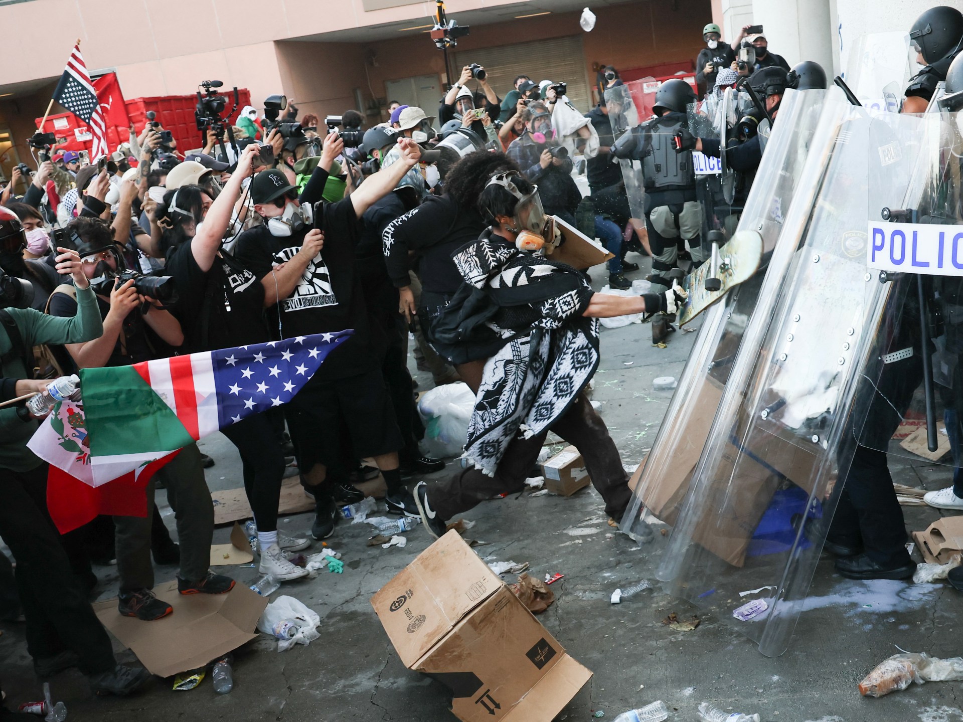 تواصلت الاحتجاجات المنددة بإجراءات وكالة الهجرة والجمارك في الولايات المتحدة، وخرج آلاف الأشخاص إلى الشوارع في مدينة لوس أنجلوس بولاية كاليفورنيا اعتراضا على سياسات الوكالة،