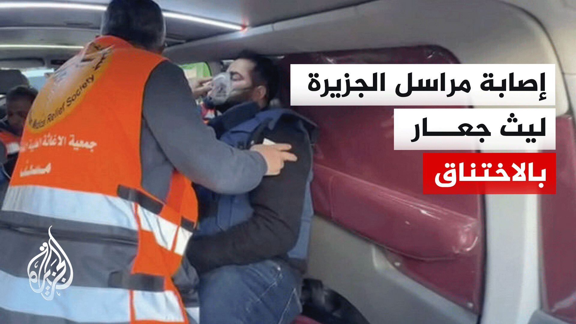 أصيب مراسل الجزيرة بفلسطين ليث جعار بحالة اختناق، اليوم الأحد، بعد استهدافه بشكل مباشر بقنبلة غاز أطلقتها قوات الاحتلال الإسرائيلي أثناء تغطيته الميدانية في مدينة