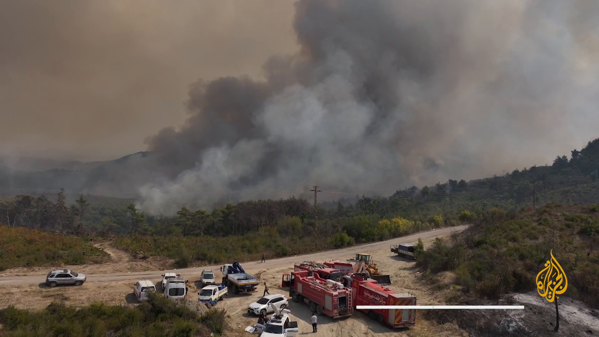 وقال مراسل الجزيرة إن الألغام الأرضية وحركة الرياح تعوق عمليات الدفاع المدني في السيطرة على الحرائق. المصدر: الجزيرة