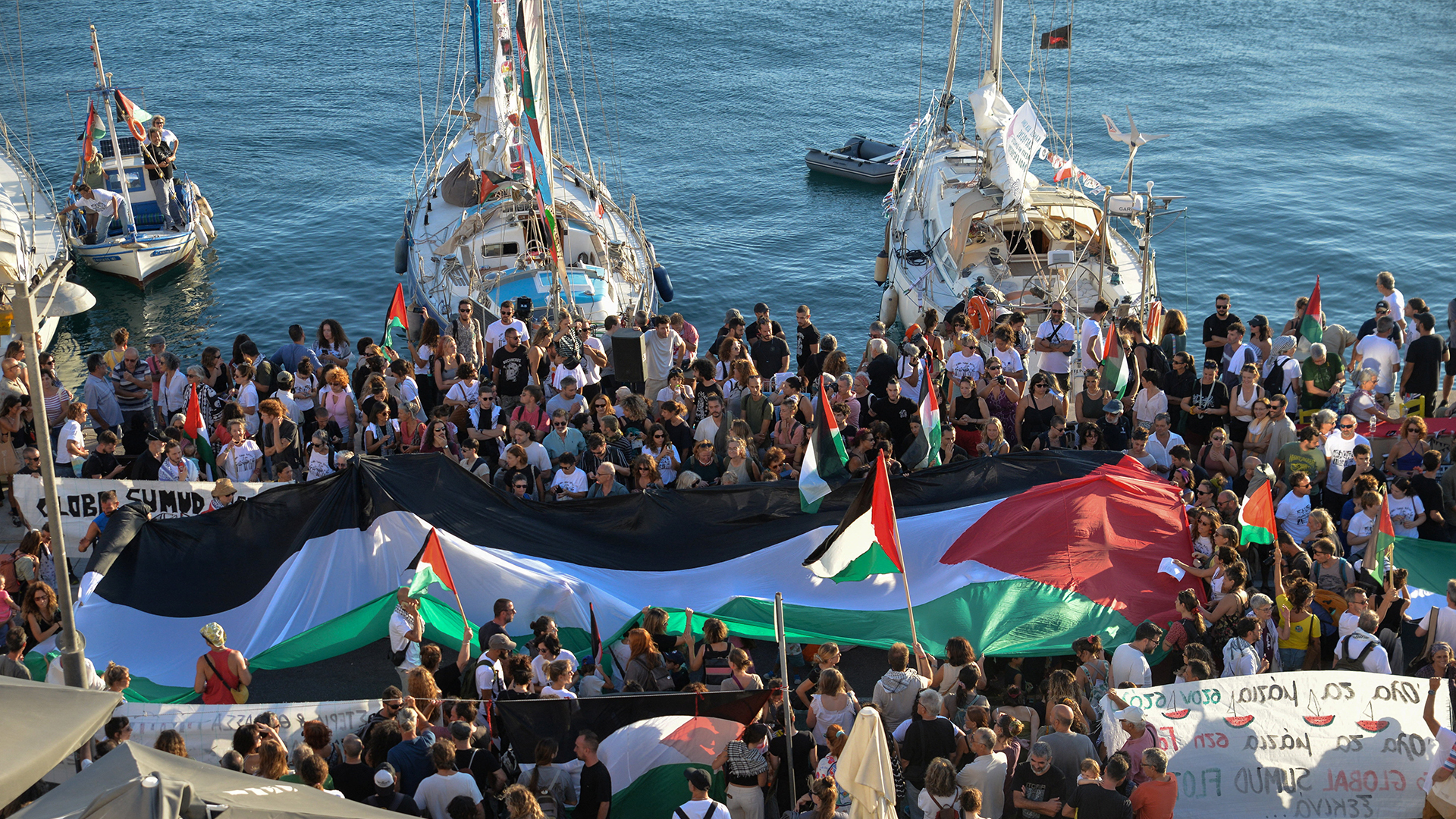 ورغم الاستهدافات الإسرائيلية المتكررة لثني المتضامنين عن مواصلة تحديهم، يواصل هؤلاء رحلتهم رغم ما يحفها من مخاطر وتهديد إسرائيلي. المصدر: الجزيرة