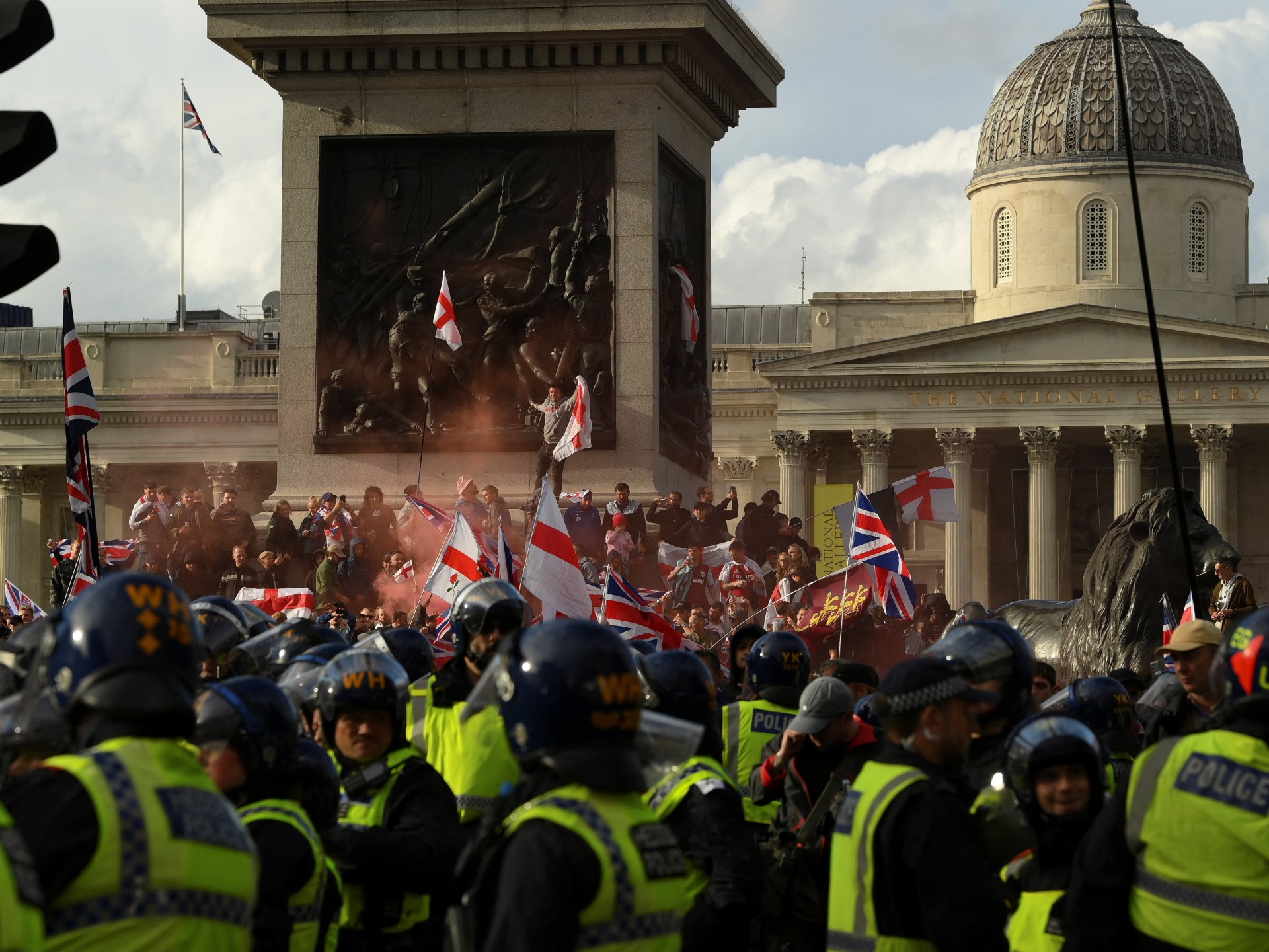 أصيب عدد من أفراد الشرطة بعد صدامات مع مظاهرة لليمين، في العاصمة البريطانية لندن، شارك فيها ما يصل إلى 150 ألف شخص، واعتقل منهم 25.