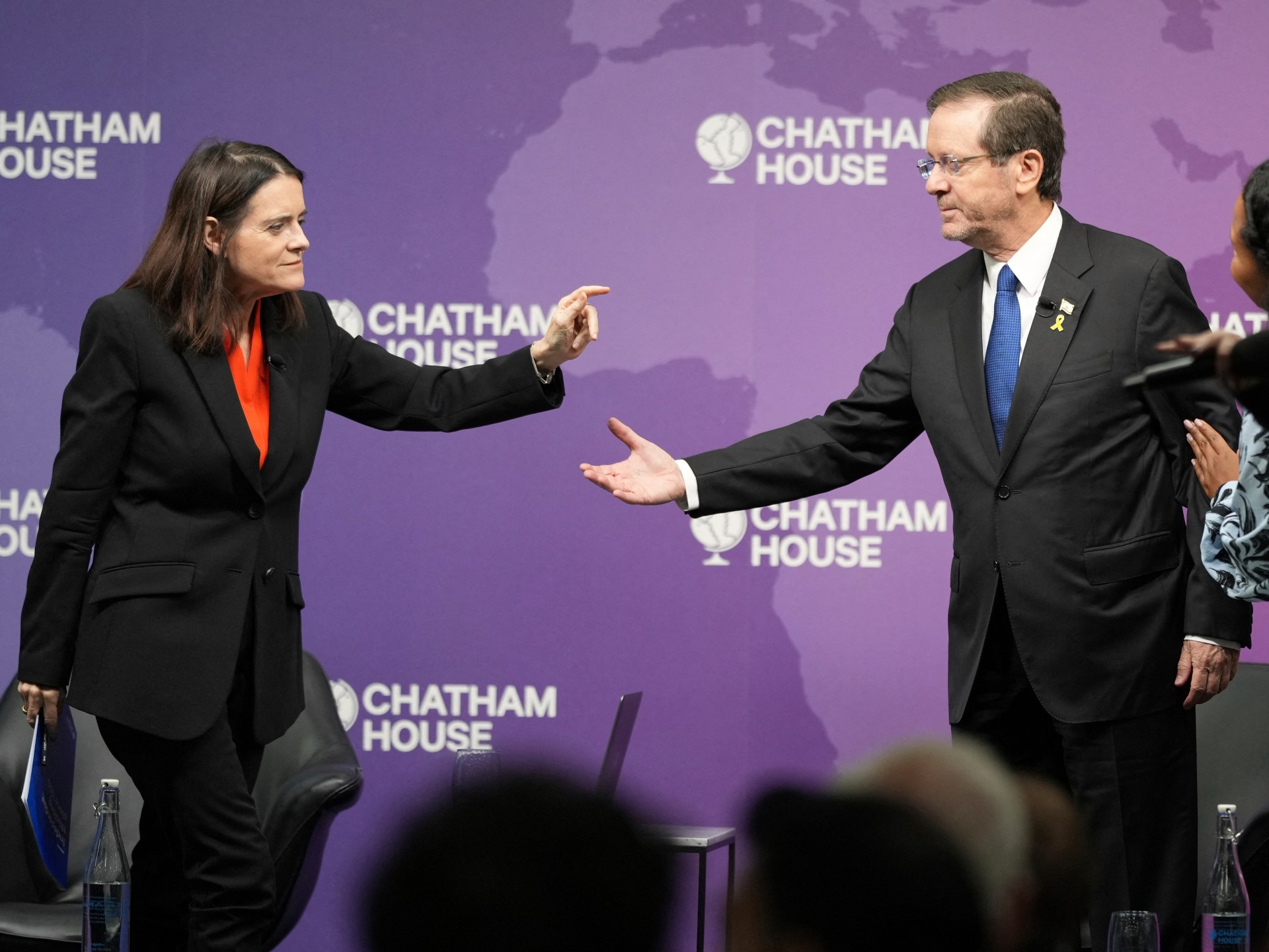 وجّهت برونوين ماريا مادوكس، مديرة معهد تشاتام هاوس البريطاني، انتقادات مباشرة للرئيس الإسرائيلي إسحاق هرتسوغ، أثناء تقديمه كضيف في الجلسة الحوارية التي نظمها المعهد يوم