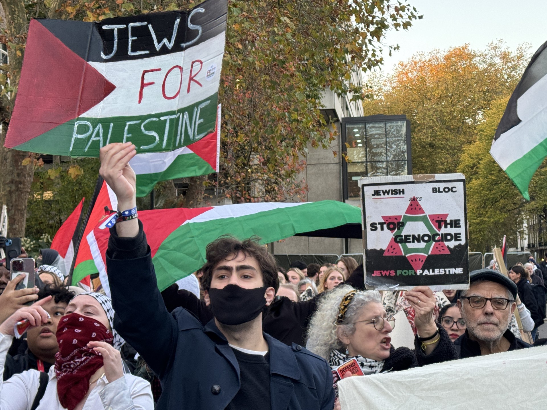 نظم طلاب يهود، متضامنون مع فلسطين، مظاهرة أمس الاثنين لدعم المقررة الأممية المعنية بحقوق الإنسان بالأراضي الفلسطينية فرانشيسكا ألبانيز، أمام كلية الدراسات الشرقية والأفريقية في