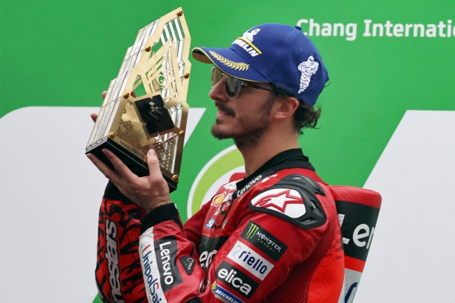 فاز الإيطالي فرانتشيسكو بانيايا، درَّاج دوكاتي لينوفو، بسباق جائزة تايلند الكبرى، اليوم، في الجولة الثامنة عشرة من بطولة العالم للدراجات النارية فئة «موتو جي بي»،