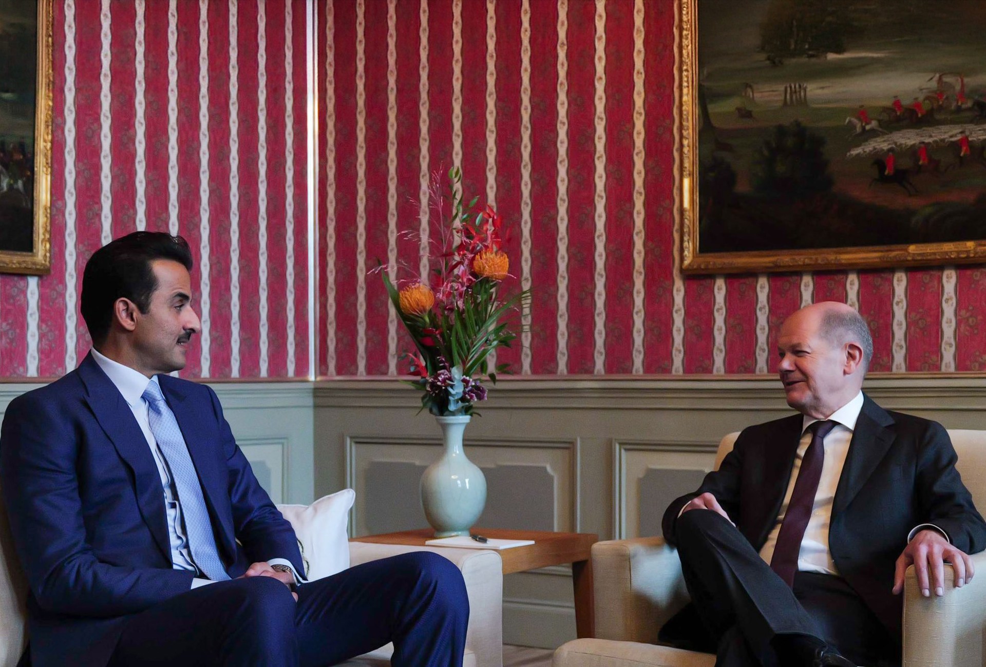 قال الديوان الأميري القطري إن أمير دولة قطر الشيخ تميم بن حمد آل ثاني بحث، اليوم الثلاثاء، مع المستشار الألماني أولاف شولتس تطورات الأوضاع بغزة