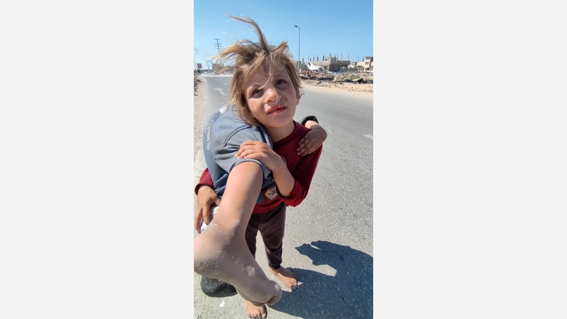 تحت أشعة الشمس الحارقة وبجسدها الصغير النحيل، وبقدميها الحافيتين حملت طفلة غزية أختها المصابة على كتفيها ومشت بها لأكثر من كيلومترين خلال توجهها إلى مخيم