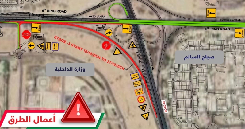 أفادت وزارة الداخلية بأن سيجري إغلاق الطريق الذي يبدأ من مخرج وزارة الداخلية (منطقة صبحان) على طريق الدائري السادس حتى النزول على مخرج طريق الملك
