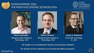أعلنت لجنة نوبل أمس الاثنين أنها منحت جائزة (نوبل) في الاقتصاد لثلاثة باحثين، هم الأمريكي من أصل تركي دارون عجم أوغلو والأمريكيان البريطانيان سايمون جونسون