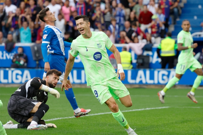 واصل المهاجم البولندي روبرت ليفاندوفسكي تألقه بتسجيله ثلاثية الفوز الثامن لبرشلونة من أصل تسع مباريات في الدوري الإسباني لكرة القدم هذا الموسم، وجاء على حساب