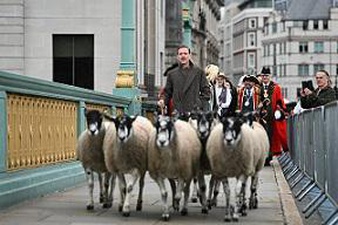 قاد الممثل البريطاني داميان لويس مئات الخراف خلال عبورها على جسر فوق نهر التايمز في وسط لندن، متوليا دور الراعي، إحياءً لتقليد بريطاني